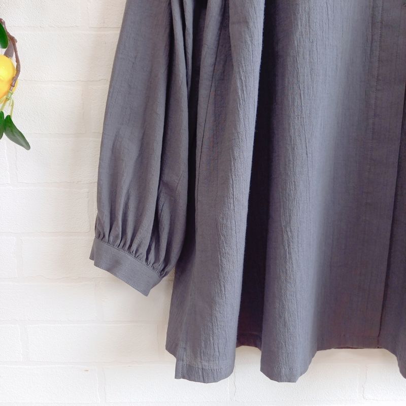 とても珍しいオーガニックコットン100%でのジョーゼット生地を使いました。ジョーゼットはクレープや日本のちりめんの一種で、シボのある織物のことです。この生地はシボが綺麗に出ていて柔らかくふんわりしなやかでドレープ性が高く独特のシャリ感があります。繊細さと優美さ、着心地・肌心地にうっとりするブラウスです。