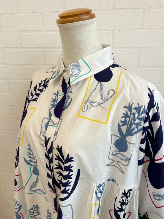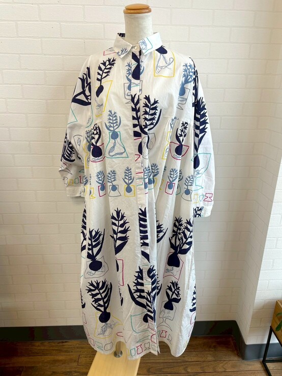 球根が見えたヒヤシンスを大胆に描いた、存在感のあるワンピース。